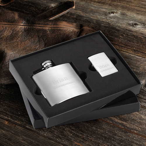 Get two-gifts-in-one with this classy duo. A personalized compact brushed finished flask allows him to carry his favorite beverage discreetly and the elegant matching genuine Zippo lighter can be conveniently stowed in a pocket or briefcase for a quick light whenever he needs it. Flask holds 4 ounces of his favorite libation. Each item is personalized with up to two lines of up to 15 characters per line. Personalization must be identical.