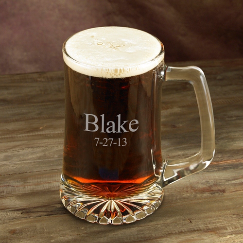 The guests at your next celebration will remember you even while they're watching the Super Bowl, when you thank them with this personalized beer mug. Classically styled with a comfortable handle and weighty bottom, this sports mug holds 25 fluid ounces of your favorite beverage. Makes a great personalized gift! Personalized with two lines of up to 15 characters per line, or a distinctive monogram.