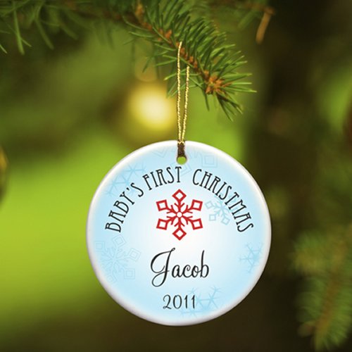 Celebrate the first Christmas of that precious bundle of joy with our pretty personalized holiday ornaments. A delicate addition to any tree, our Baby Boy's First Christmas ceramic snowflake-adorned ornaments feature a blue background with two different designs.