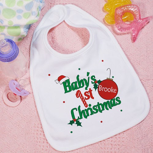 A Baby's 1st Christmas is one to photograph, video tape and cherish for a lifetime. Our Baby's 1st Christmas Bib will help keep your little darling clean throughout the day so they look great in every captured moment. Our Personalized 1st Christmas Bib is available on our premium white 100% cotton, soft cloth with trim Bib. Machine washable in one size, features easy snap closure. Includes FREE Personalization! Personalize your Baby's 1st Christmas Bib with the little one's name.