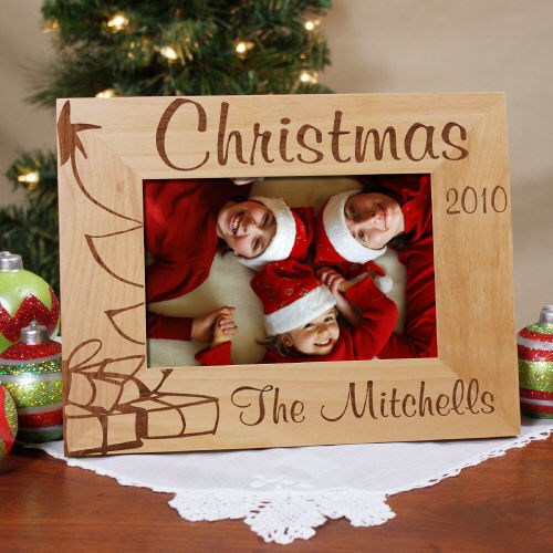 Personalized Christmas Tree Picture Frame - Engraved Christmas Picture Frame. Christmas is a wonderful time of the year to share a warm, family portrait or fun photo of the kids with the Grandparents, Aunt, Uncle or distant relatives. Our Christmas Tree Personalized Wood Picture Frames measures 8¾" x 6¾" and holds a 3½" x 5" or 4" x 6" photo. Easel back allows for desk display. Includes FREE Personalization! Personalize your Christmas Tree Wood Picture Frame with any year and any one line custom message.