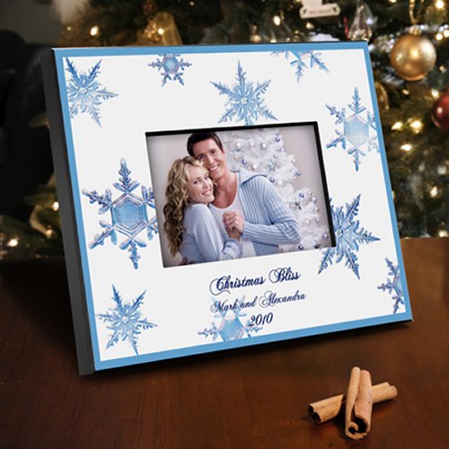 Beautiful crystalline snowflakes encircle your most treasured winter or holiday-related photo when you display it in our elegant personalized Crystal Snowflake Picture Frame. Detailed snowflakes appear luminescent in shades of blue and lavender, and the background is surrounded by a blue border and narrow black frame. Frame measures 8" x 10" and holds a 4" x 6" picture. Personalize each of the three lines with up to 25 characters per line.