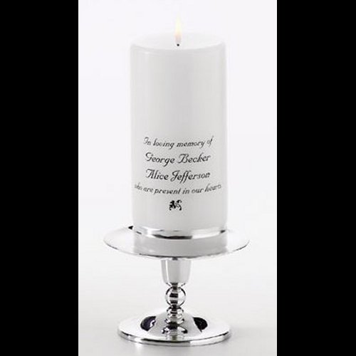 Include the memory of a loved in your wedding celebration with this extraordinary wedding memorial candle. It is banded in gold or silver and hand printed (not a cheap sticker) with the phrase "In loving memory of [name] who is/are present in our hearts." Includes one 3" x 6" personalized wedding memorial candle. (Stand not included). Choose white or ivory candles, and black, gold or silver ink. Accommodates up to 3 names.