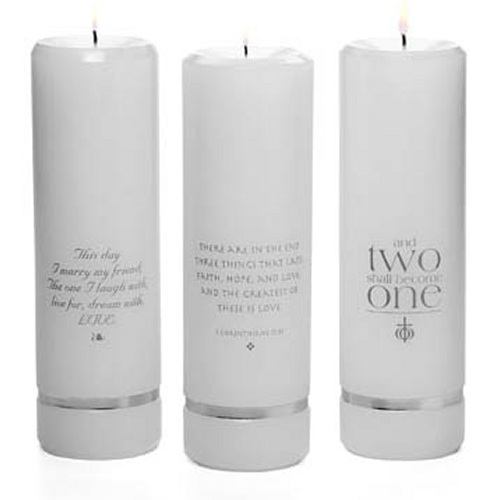 Choose a printed unity candle for your ceremony: each simple design expresses a lasting sentiment that you'll want to keep as a memento after the big day is over. Choose from 3 different designs. Each 3" x 9" white unity candle has a silver band and is hand printed in silver ink.