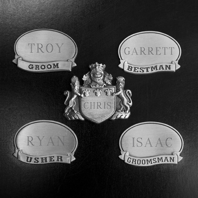 Celebrate the big day with a shot -- or at least a shot glass -- a gift all your groomsmen will appreciate! Featuring one of 4 pewter medallions to honor each man's special role in the wedding ceremony -- choose "Best Man", "Groomsman" or "Usher" title or ornate coat of arms medallion to add your own custom message! Artfully engraved with any 1-line personalization, up to 12 characters per line. Holds 2.25 oz. of your favorite beverage. Cheers!